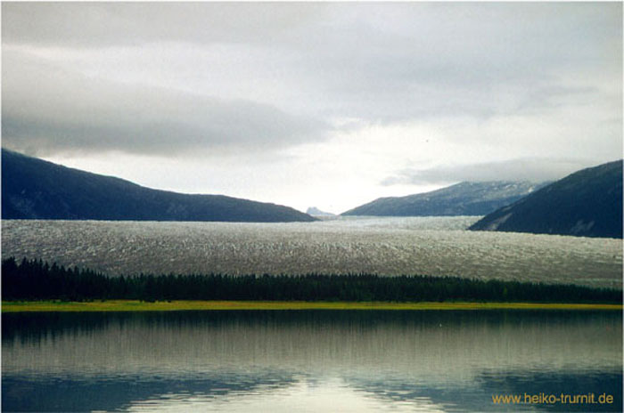 Nun geht’s wieder südwarts. Am Quarz Lake wagen wir ein kühles Bad. Die himmelstürmenden Wrangell Mountains grüßen aus der Ferne. Hinter Delta Junction böse gravel road, Baustellen, Staub, Schlamm, Schotter, Löcher, Baufahrzeuge. Im Kluane Wilderness Park sichten wir einen Schwarzbären. Hinter dem Kluane Lake die St. Elias Mountains.